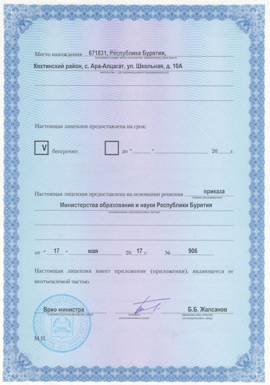 - Места осуществления образовательной деятельности по основным программам профессионального обучения: 671831, Республика Бурятия, Кяхтинский район, село Ара-Алцагат, ул Школьная, 10